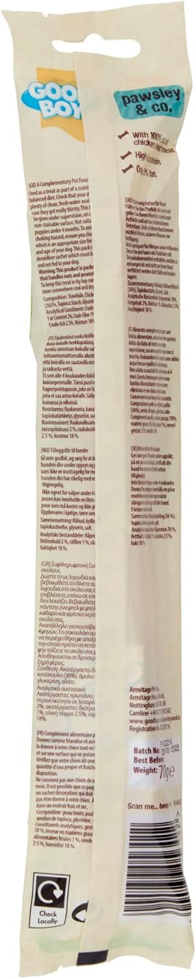 I’m made with 100% natural chicken breast and am sure to get your dogs’ tail wagging. Super yummy chicken is wrapped around my long and chewy rawhide centre, creating the perfect treat for rewarding your large or giant pooch at home or whilst out and about.