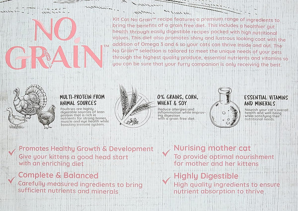 Kit Cat No Grain recipe made with chicken, duck, and turkey includes a range of premium ingredients to provide the benefits of a grain-free diet. This includes healthier gut health through easily digestible recipes packed with high nutritional values. This diet also promotes a shiny-looking coat with added Omega 3 and 6 so your cat can grow healthy inside and out. The No Grain selection is designed to meet the unique needs of your cat through the highest quality products, essential nutrients, and vitamins so you can rest assured that your furry friend only receives the best.