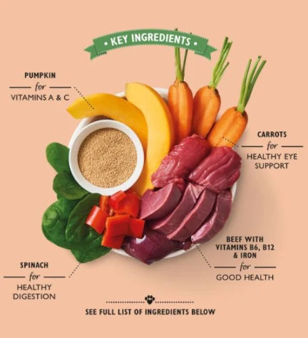 - Proper and balanced recipe with a high meat content of beef, pumpkin and red pepper for sources of protein which develops muscle mass and sustains beautiful skin and coat