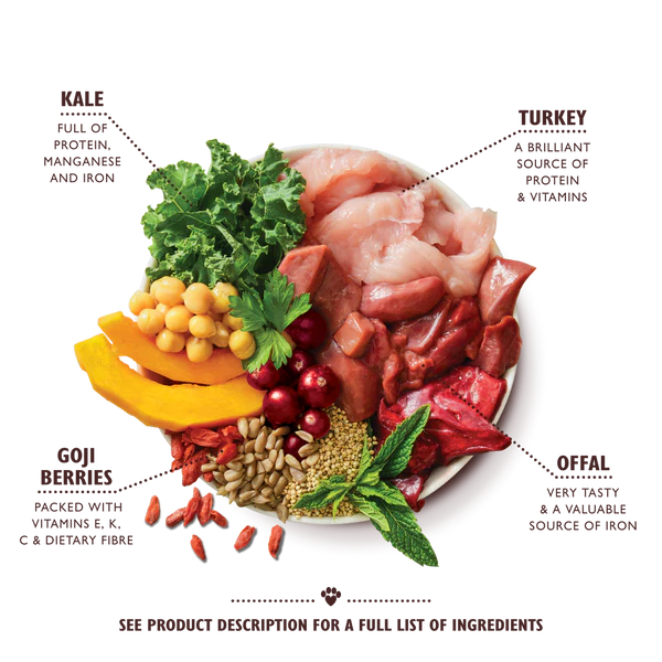 Whilst this is our lowest fat recipe, making it perfect for dogs who need to watch their intake a little more than usual, it’s also great for an extra boost from nature’s best foods. Kale is a fantastic source of vitamin A and C, manganese and potassium, whilst the goji berries are packed with vitamins C, E and K.