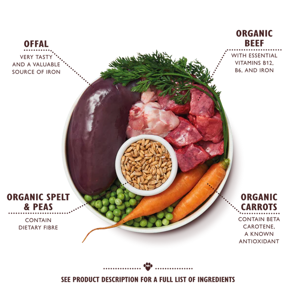 A hearty organic recipe made with fresh beef, chicken and pork, together with carrots, peas and spelt.
