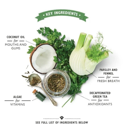 Ingredients - Potato Flour, Tapioca Starch, Glycerine, Cellulose, Nutritional Yeast, Algae (2.2%), Fennel (0.3%), Coconut Oil (0.3%), Green Tea Extract (0.2%), Parsley (0.1%).